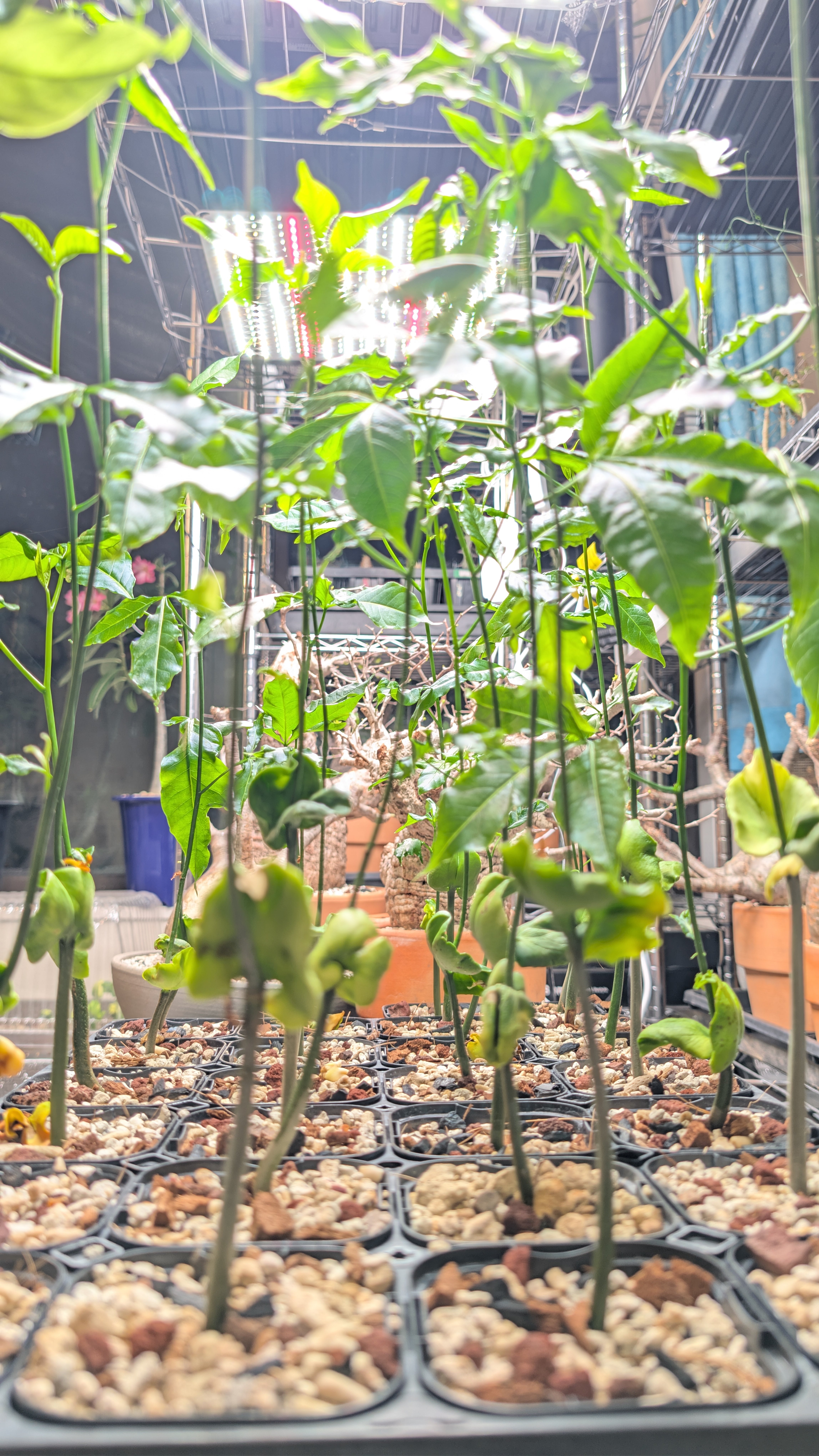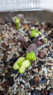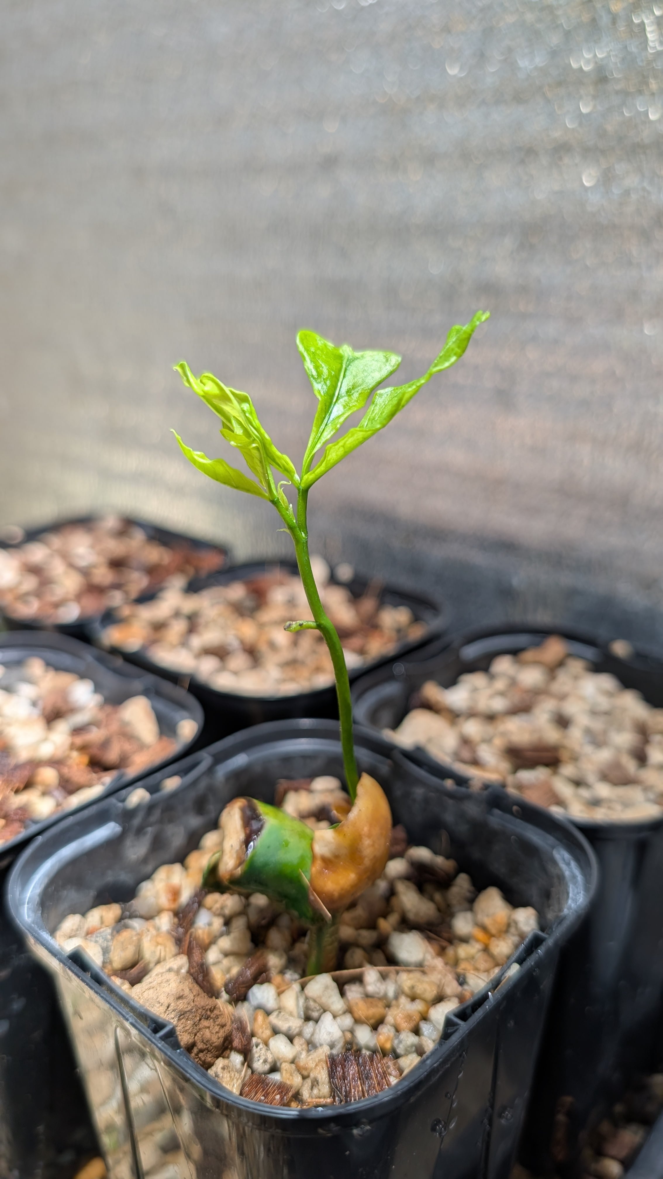 丸く重量感のある大粒の種子は、この種特有の特徴で、発芽後は基部がふっくらと膨らむ壺型の幹へと育ちます。